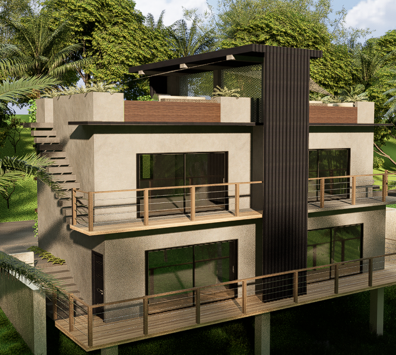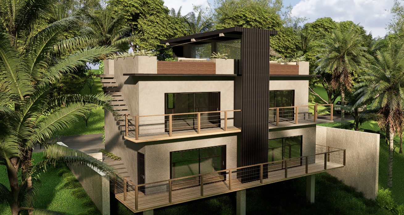 Discover the perfect balance between contemporary design and natural beauty with this two-story modern duplex, surrounded by lush tropical greenery. Each unit offers 1,054.70 sq. ft. of thoughtfully designed living space, featuring open-concept interiors, floor-to-ceiling windows, and seamless indoor-outdoor flow. The highlight of the home is its private rooftop terrace, where you can unwind and enjoy panoramic views of the jungle canopy and evening sunsets.